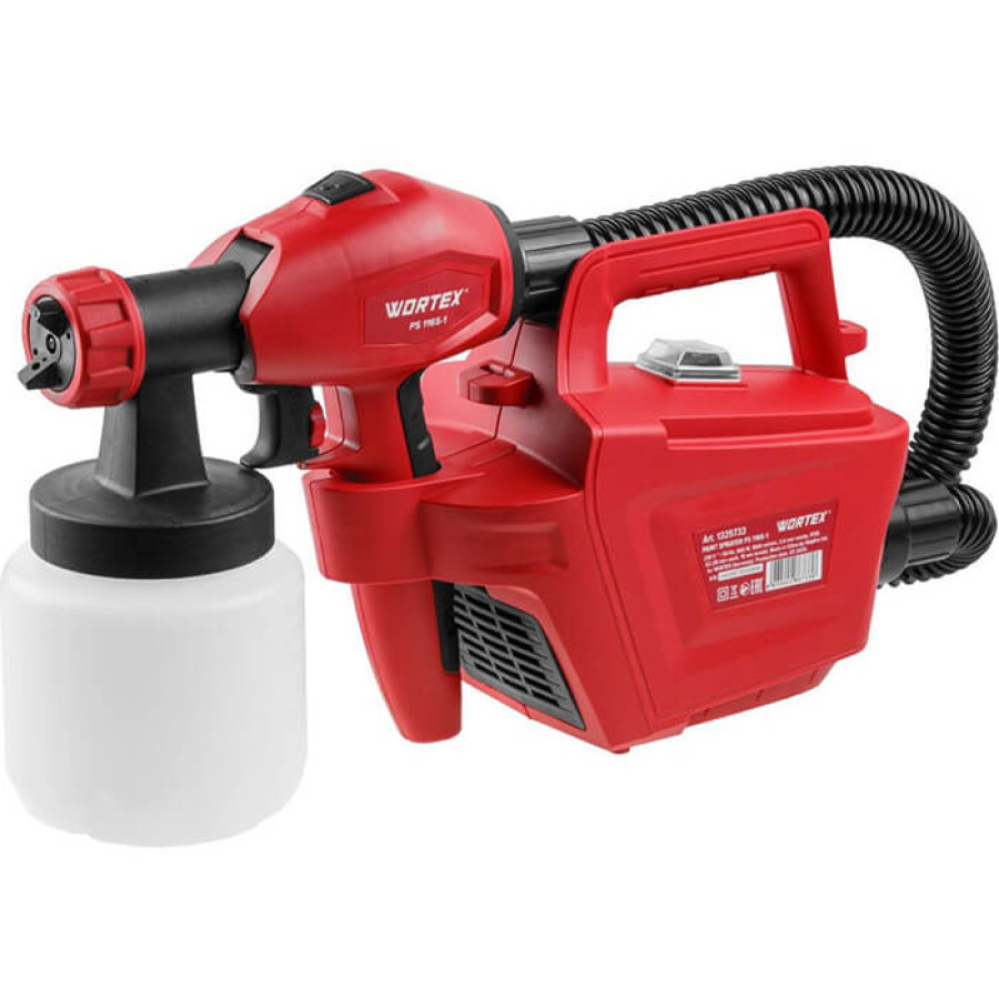 - В комплекте: краскораспылитель Wortex PS 1165-1 (1325733), бачок для ЛКМ, кабель питания. Доп. насадки/сито/мерный стакан — по наличию, уточняйте при заказе.