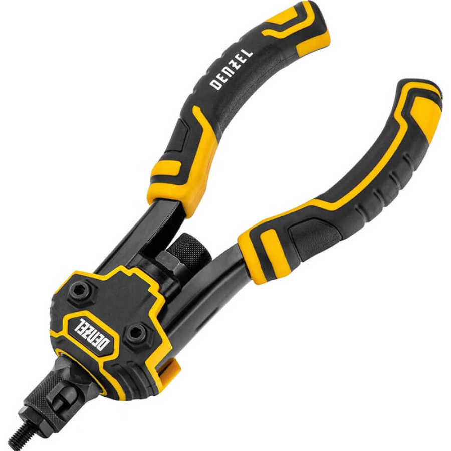 Denzel 40501 — ручной заклёпочник для установки вытяжных (поп-) заклёпок в листовой металл, профиль, тонкостенные конструкции и пластиковые панели. Помогает быстро и аккуратно соединять детали там, где нет доступа с двух сторон или применение сварки/болтов нецелесообразно: кузовные и вентиляционные работы, сборка корпусов, фасадных кассет, шкафов и декоративных панелей.